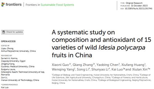 本网讯(通讯员 王智勇 王智勇/文 罗凯/图) 生物与食品工程学院副教授罗凯博士以36365线路检测登录入口为第一单位在国际食品权威学术期刊Frontiers in Sustainable Food System(中科院二区,五年影响因子5.4)上发表题为“A systematic study on composition and antioxidant of 15 varieties of wild Idesia polycarpa fruits in China”的最新研究成果。论文第一作者系36365官网食品科学与工程2021级研究生郭小妮同学。