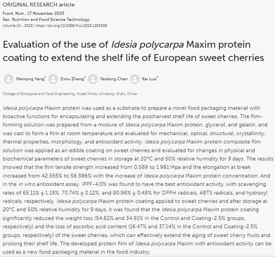 本网讯(通讯员 王智勇 王智勇/文 罗凯/图) 生物与食品工程学院副教授罗凯博士以36365线路检测登录入口为第一单位在国际食品权威学术期刊Frontiers in Nutrition(中科院二区,五年影响因子5.7)上发表题为“Evaluation of the use of Idesia polycarpa Maxim protein coating to extend the shelf life of European sweet cherries”的最新研究成果。论文第一作者系36365官网食品科学与工程2021级研究生杨文清同学。