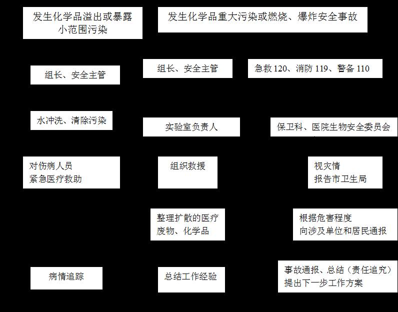 4.3 应急报警员职责:应立即报告保卫民大附属医院感染管理科医务科,由到场医院职能部门工作人员或管理人员视情况向市疾病预防控制中心CDC)报告,造成人员伤亡的,应及时拨打“110”电话报警。引起较大火灾时,拨打“119” 火警电话。造成环境污染的要向市环保部门报告,并在力所能及且安全的情况下组织专业教师进行现场紧急补救。