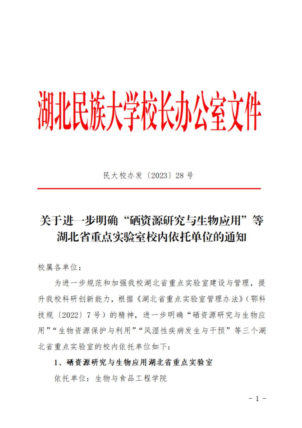 关于进一步明确“硒资源研究与生物应用”等湖北省重点实验室校内依托单位的通知