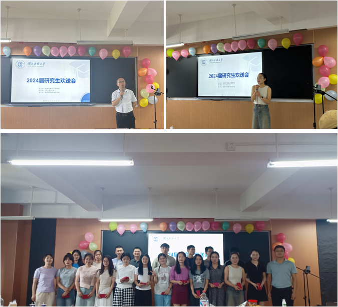 学院党总支书记周志在欢送会上致辞:这个夏天,是同学们一生中非常特别、非常重要的季节,你们即将告别母校,踏上新的征程!亲爱的同学们,毕业不是结束,而是新的开始,祝你们前程似锦、未来可期!愿你们在人生道路上勇往直前、再创辉煌!随后,学院领导和教师代表为毕业生们送上了毕业礼物和祝福;毕业生代表徐晨凤同学上台发言,分享了自己在研究生期间的学习和生活经历,并对师弟师妹们提出了珍惜时光、认真科研、快乐生活的建议。
