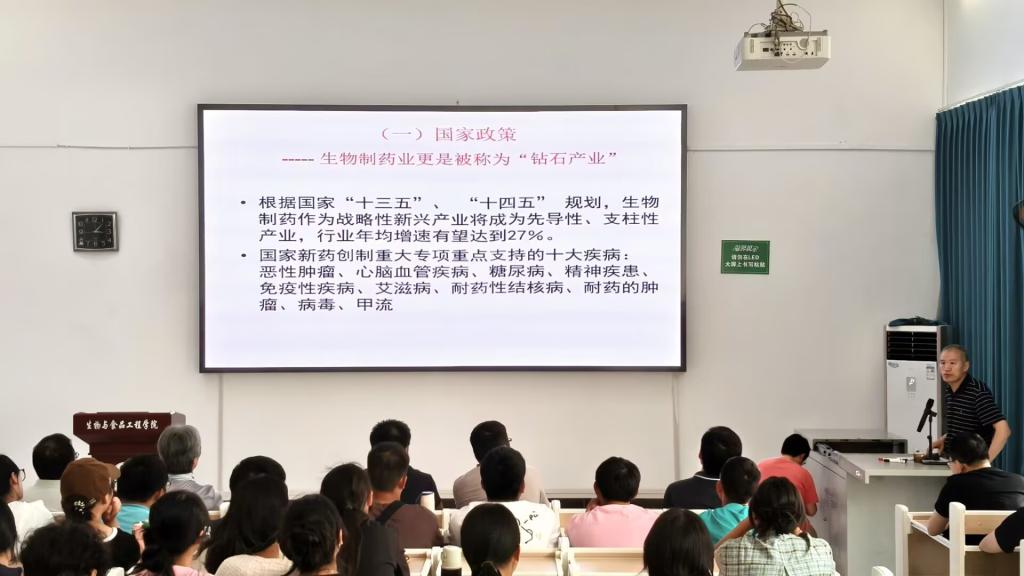 9月18日,刘晓鹏教授在4202教室主讲,解析发酵工程制药等五大研究方向,结合国家“十四五”规划,阐述行业27%年均增速的战略地位,介绍依托省级实验示范中心的办学条件及43家企业实习基地,建议新生聚焦“文凭、技能、人格、友情”四大成长目标。