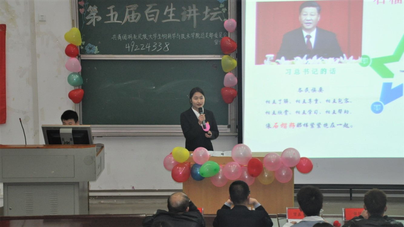 大赛分为“主题演讲”和“学习一点通”两个环节。主持人简单开场后,八位选手以中国共产党的发展历程为出发点,从“不忘初心,继续前行”、“习党史,跟党走”等为主题分别上台进行主题演讲。他们向大家深入讲述学习党史的意义和民族团结的重要性,表达对当代青年的厚望,希望他们肩负重任,勇担历史使命,紧跟党的步伐,树立远大理想,积极学习党史,以赤子之心为人民,以奉献之心报祖国。在“学习一点通”环节中,八位选手通过诗朗诵,唱歌,情景剧的形式,向现场听众展示他们对中国共产党的热爱与坚定的信仰。其中七号选手龙芳,以“石榴颗颗,共创未来”为演讲主题,引用习近平总书记的“各民族之间的关系,要像石榴籽一样紧紧抱在一起”来强调民族团结是人民的选择,也是历史的选择。她说,我国五十六个民族,都是平等的一员,共同构建了中华民族利益共同体。她鼓励新时代的我们,要将民族团结的诗篇写在祖国的大地上。最后,龙芳以89分的高分,荣获我院百生讲坛演讲比赛一等奖。