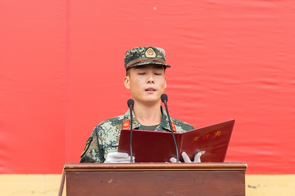 祝建波宣读军训团成立文件,吴建清为军训团授旗。宋强和承训教官代表谢理想先后发言,他们表示将在军训期间科学施训、严格管理,以言传身教的姿态将良好的军人作风及精神展现给新生。