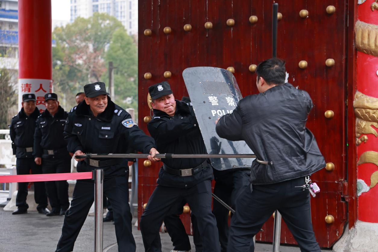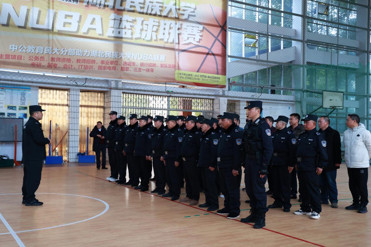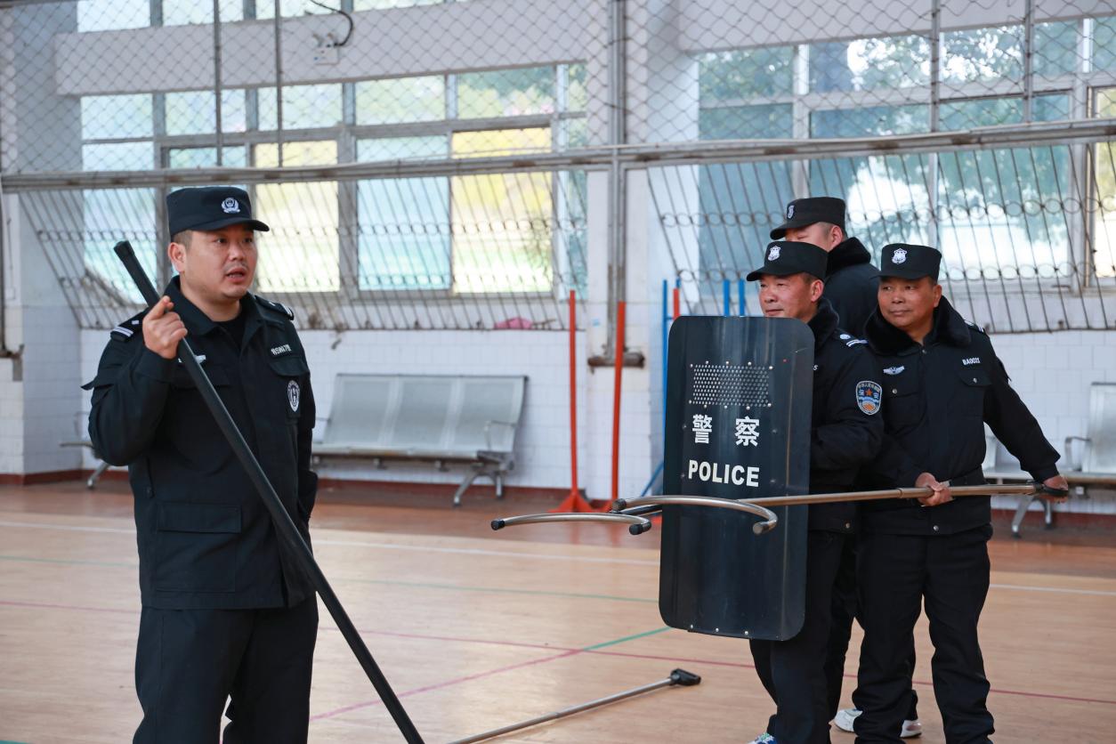 恩施市公安局特警大队副大队长梅恋寒、特警队员王苗在室内篮球馆详细讲解了防刺服、警棍、防暴盾、钢叉等常用安保器械的使用方法、动作要领及注意事项,并做了标准的使用演示;指导安保人员进行了三人、四人为攻防小组的防暴演练。为强化培训成果,在校大门组织安保人员进行了现场模拟实操演练。