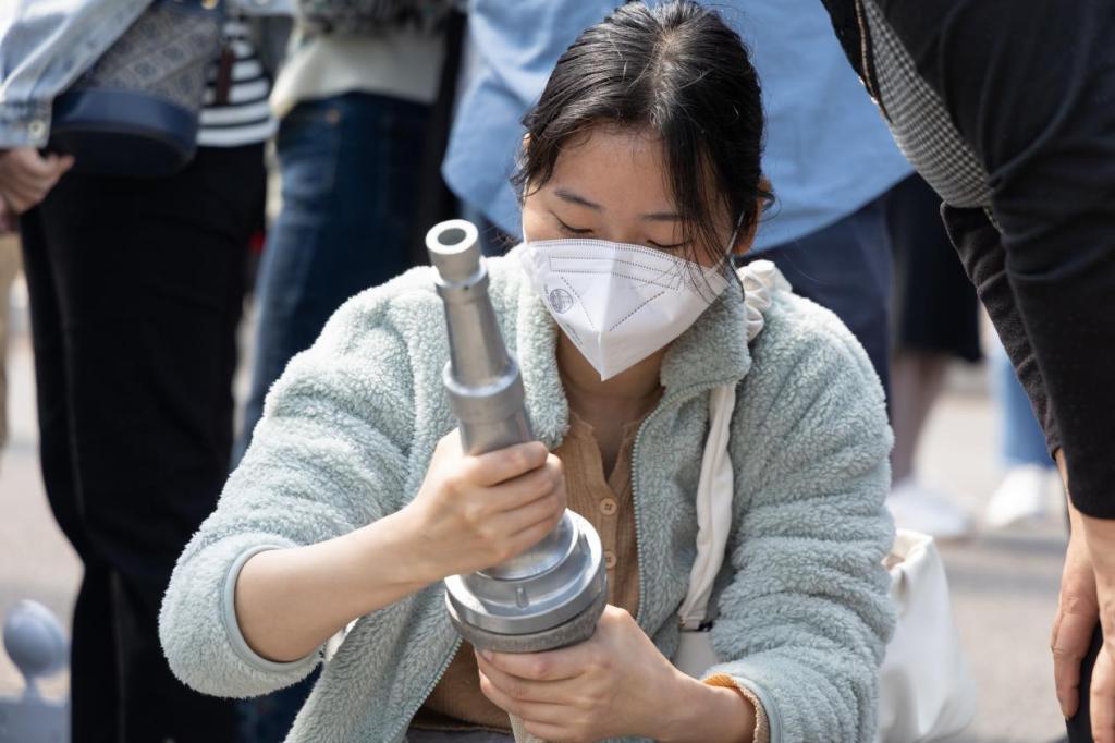 学生在寝室楼栋前屏幕上观看防灾减灾宣传片