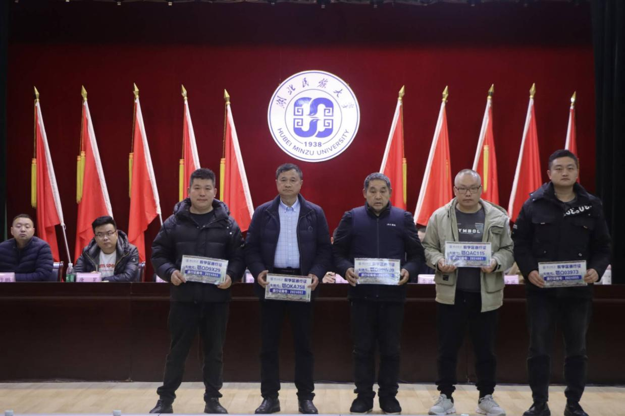 商户及驾驶员代表上台签订校园交通安全承诺书并作表态发言,保卫处校园秩序科科长谢整文为代表发放教学区车辆通行证。
