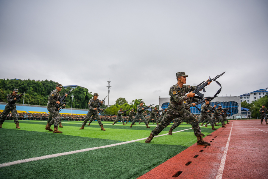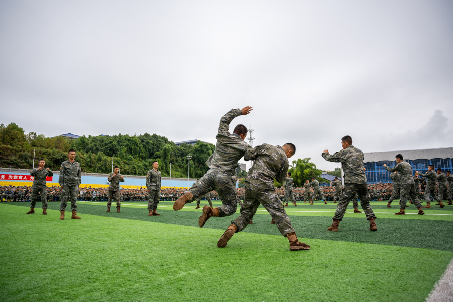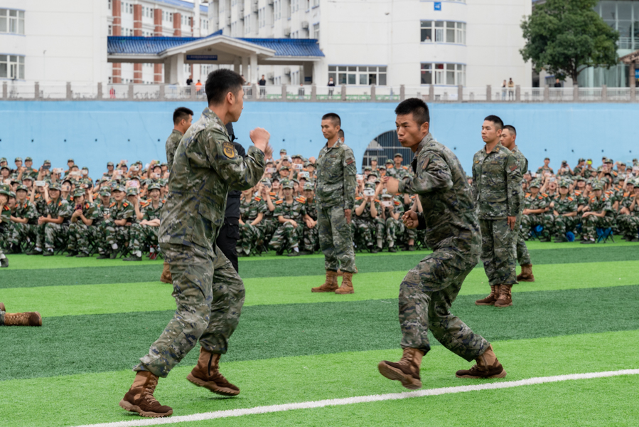 承训教官作分列式、格斗术、刺杀操等科目的军事表演,以过硬的军事素质和顽强的军人作风,展现出了英姿飒爽的军人风采,赢得全场师生的热烈掌声。
