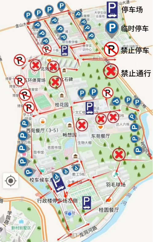 实行“三大门岗进出、校园全面开放”的总体通行政策,东门、南门车辆和行人可双向进出;西门人员可双向进出,车辆只出不进。