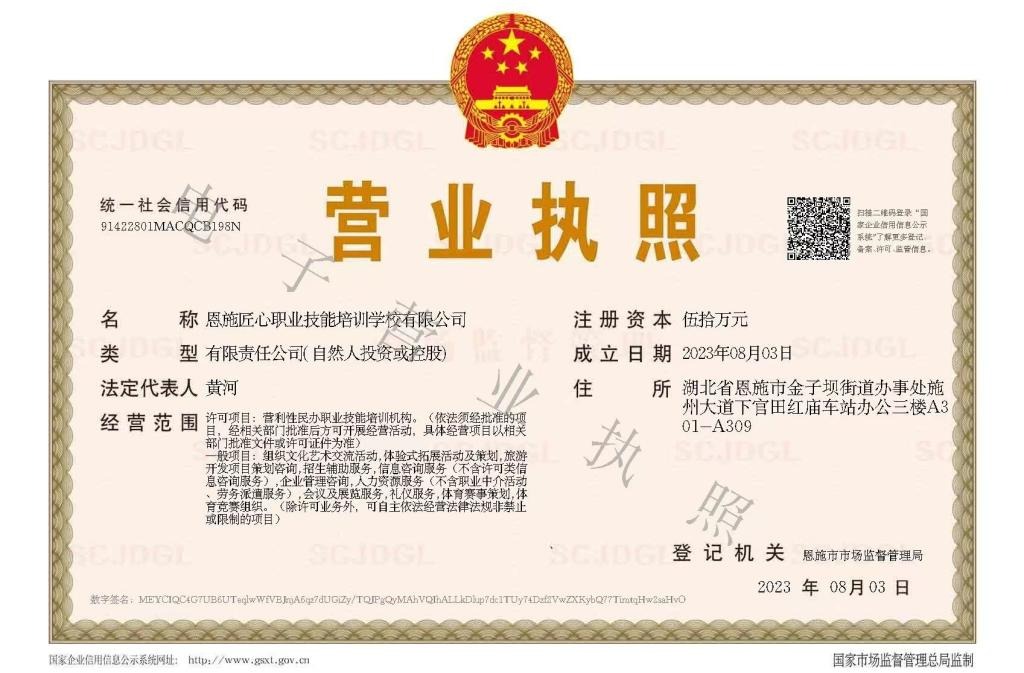 2021年,黄河牵头成立湖北鞋漂亮洗涤服务有限责任公司,出任监事,正式开启创业征程。2023年,他作为主创人员成立恩施匠心职业技能培训学校有限责任公司,担任法定代表人。该校经人社局批准,致力于构建“培训+考试+创业就业”一站式服务体系,开设导游、茶艺、互联网营销等十大技能专业及青年夜校24类课程,累计吸引学员200余名。2024年,该项目荣获“宜荆荆恩”大学生创新创业大赛恩施州初创组三等奖,年营业额突破100万元。