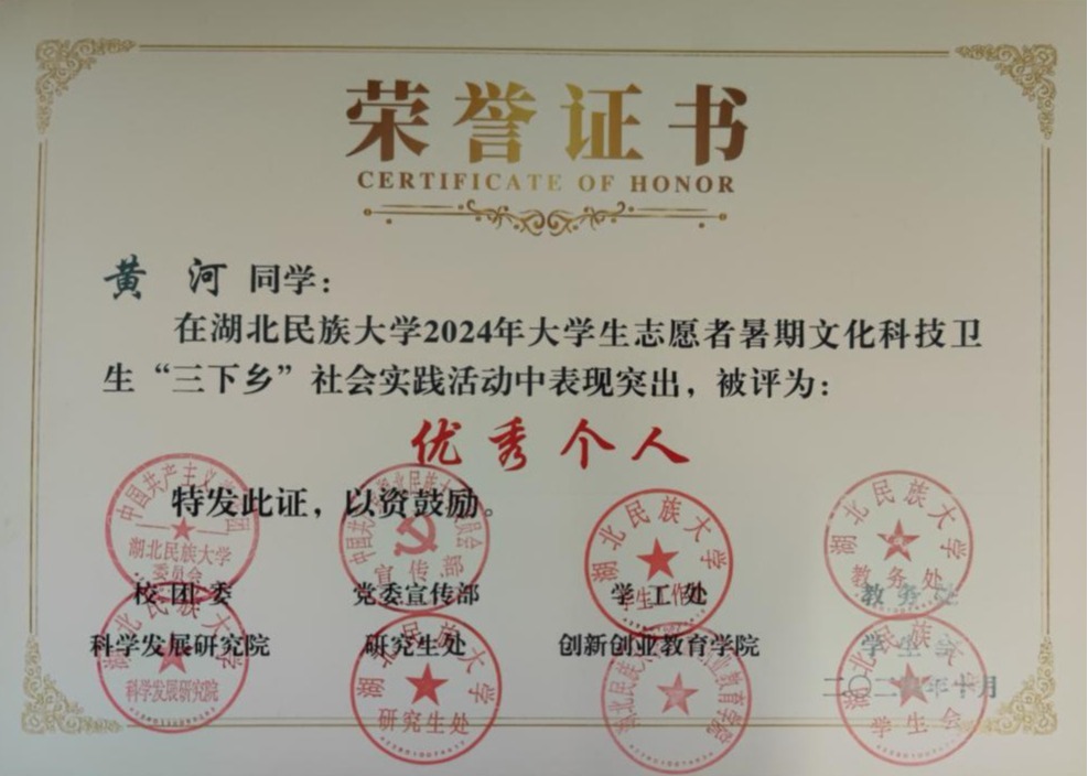 在校期间,黄河始终严于律己,积极投身学生工作与创新创业实践,获得近20项个人荣誉及30余项创新创业奖项,并担任恩施州创新创业理事会理事、创新创业中心副主任等职务,成为当地青年创新创业的代表人物。