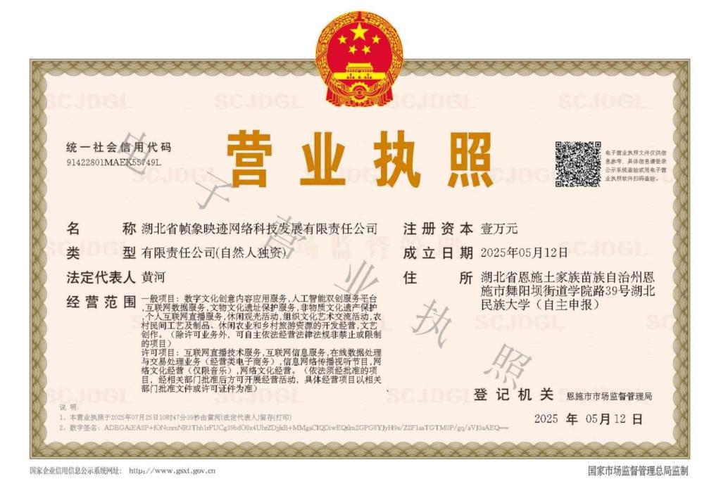 2025年,黄河创立湖北省帧象映迹网络科技发展有限责任公司,聚焦互联网短视频创作与推广。公司与多家旅游企业达成战略合作,运营覆盖恩施、港澳、日韩及东南亚等国内外热门目的地的抖音推广账号,有效帮助合作企业提升流量与经济效益。