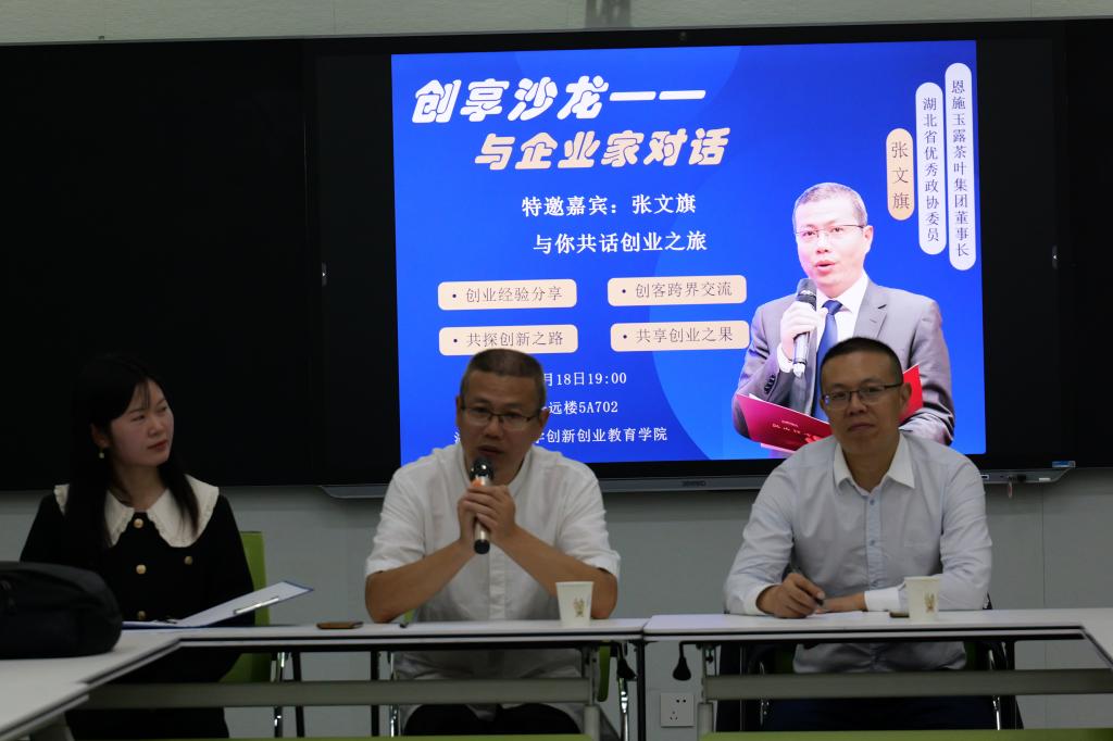 2024-10-19 20:18:27 点击量:10月18日晚,创新创业教育学院在修远楼5A702教室举办第二十六期创享沙龙活动。本期沙龙以“与企业家对话”为主题,恩施玉露茶叶集团董事长、湖北省优秀政协委员、湖北省十大优秀茶业企业家、恩施州首届“恩施工匠”、恩施玉露茶产业协会会长、湖北省工商联(商会)副会长、湖北省劳动模范张文旗担任主讲人,创新创业教育学院副院长李超,项目管理科科长谢杰兰以及部分学生参加活动。谢杰兰担任活动主持人。