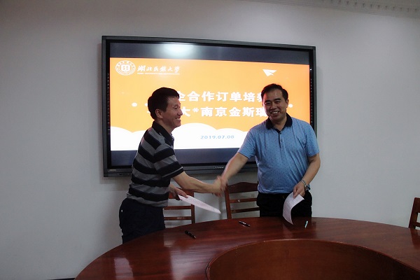 本网迅(通讯员 刘佳/文 彭璟/图)7月8日下午,生物科学与技术学院与南京金斯瑞生物科技有限公司在至真楼二楼会议室举行校企协同育人订单培养班开班仪式。南京金斯瑞生物科技有限公司副总经理徐士军,人事部经理卢占伟,36365官网教务处副处长谭华,该院党总支书记邓顺松,院长张驰,生物制药系系主任刘晓鹏出席仪式,学生科、教学科相关负责人和第一期订单培养班的20名学生参加了此次开班仪式。张驰与徐士军签订校企合作订单培...