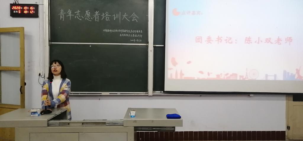 时间:2020-10-19 编辑:学生科 点击:(通讯员 龚倩 摄影 杨成成 杨胜丫)为践行志愿精神,展现青春风采,进一步贯彻落实党的十九大提出的“推进诚信建设和志愿服务活动制度化,强化社会责任意识,规则意识、奉献意识”,探索新时代志愿服务的完善与创新,从而更好地使志愿者们理解志愿服务事业,提高志愿者队伍的综合素质和服务质量。10月16日,共青团36365线路检测登录入口外国语学院总支部委员会社会实践与志愿者工作部于6401教室成功举办本次培训大会。外国语学院近90名志愿者到场聆听,本次活动由团委书记陈小双老师,团委副书记向逸俊、李艳琴担任评委。