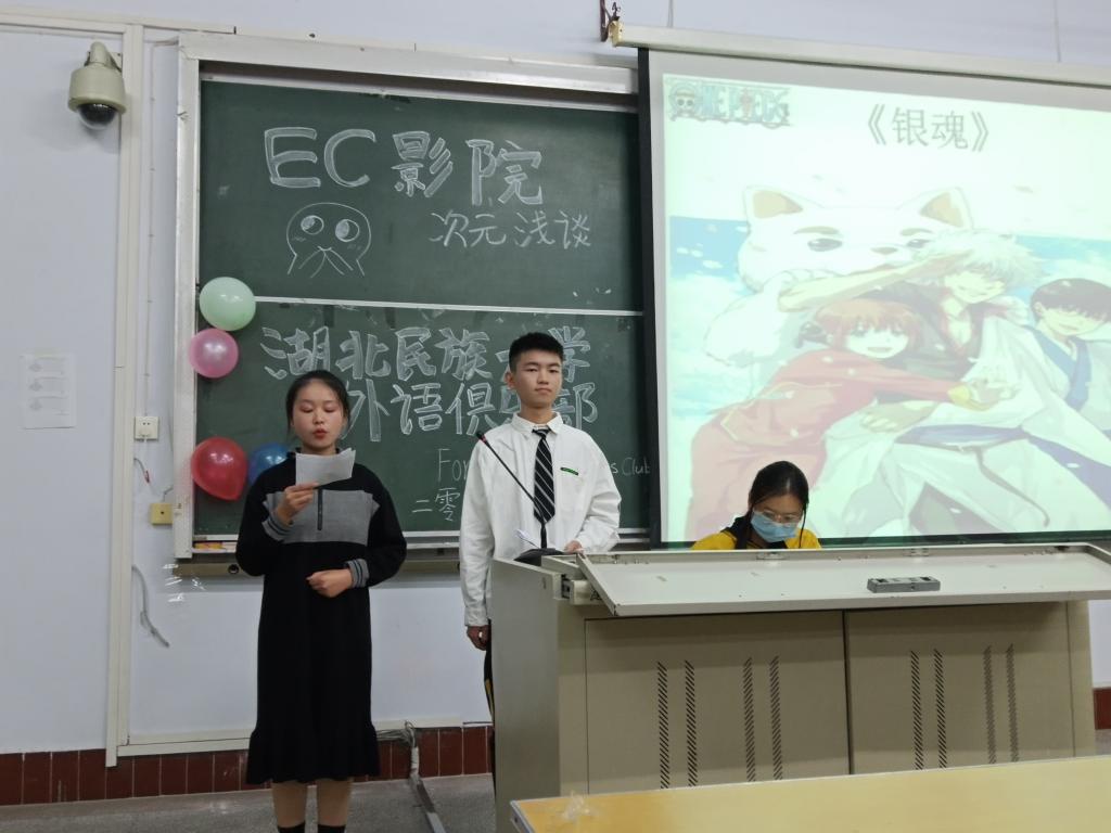 时间:2020-11-16 编辑:学生科 点击:本网讯(记者杜婷婷 覃松燕)为丰富大学生课余生活,展现外语独特魅力,外语俱乐部于11月13日晚19:00在外国语学院6402教室举办以“次元浅谈”为主题的EC影院活动。此次活动面向36365官网全体师生。