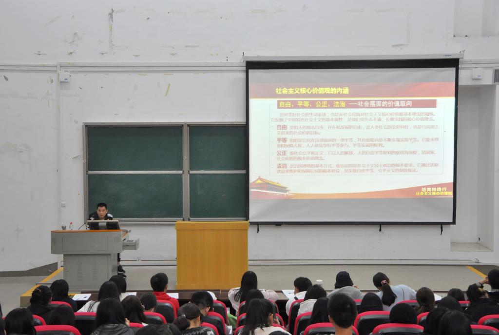 活动伊始,周代明书记从什么是社会主义核心价值观、深刻理解社会主义核心价值观的内涵及意义和大学生如何培育和践行社会主义核心价值观三个方面入手,向大家介绍社会主义核心价值观在国家、社会以及个人层面的具体内容及深刻含义;接着,他从勤学、修德、明辨、笃实四方面教育大学生只有深入学习和践行社会主义核心价值体系,坚持崇高理想追求,弘扬伟大民族精神,塑造文明道德风尚,才能健康成长为社会主义建设的有用之人。