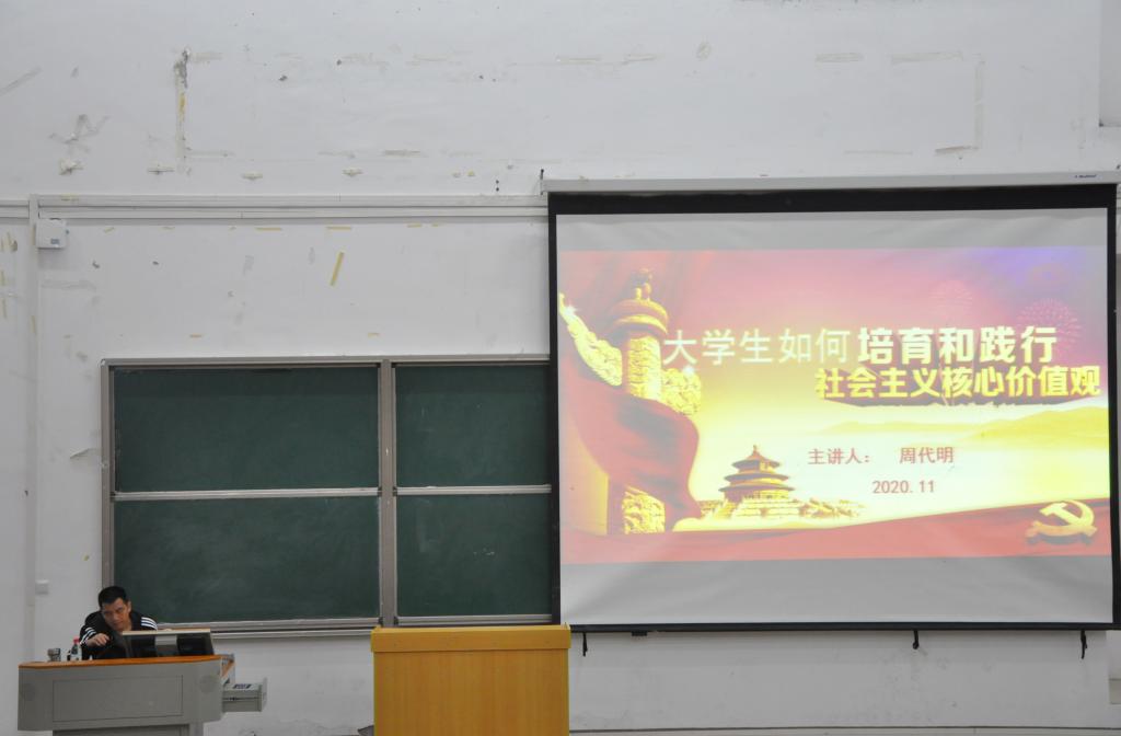 时间:2020-11-16 编辑:学生科 点击:本网讯(通讯员 张迈迈/摄影 蔡莎莎)11.16日晚,我院于修远楼5A207成功举办以“大学生如何培育和践行社会主义核心价值观”为主题的青马工程暨第十五期学生干部综合素质培训第三次授课。我院党总支书记周代明担任主讲人。2020级学生干部及青马工程学员到场学习。