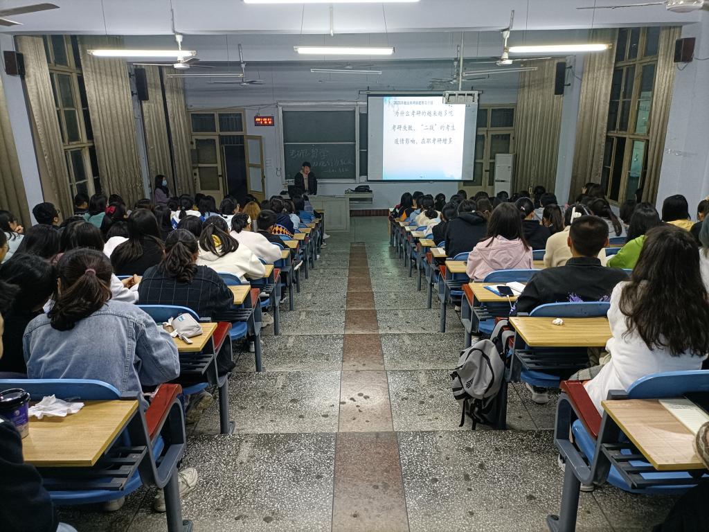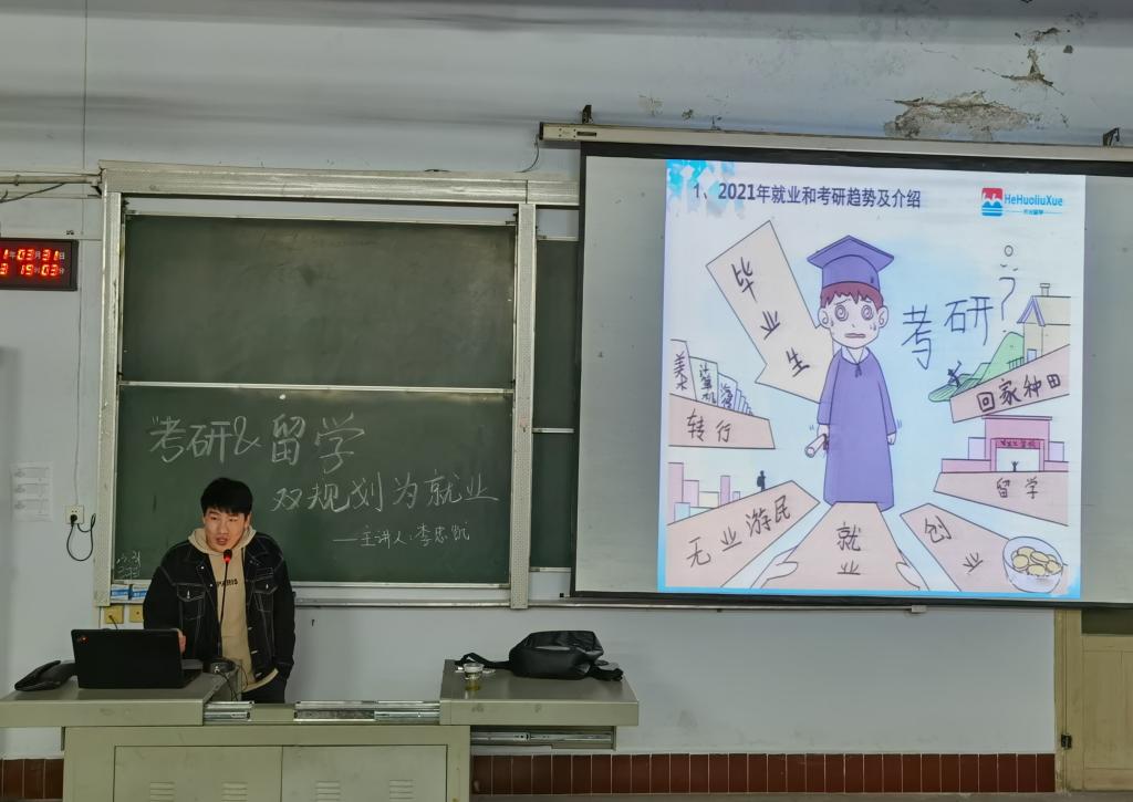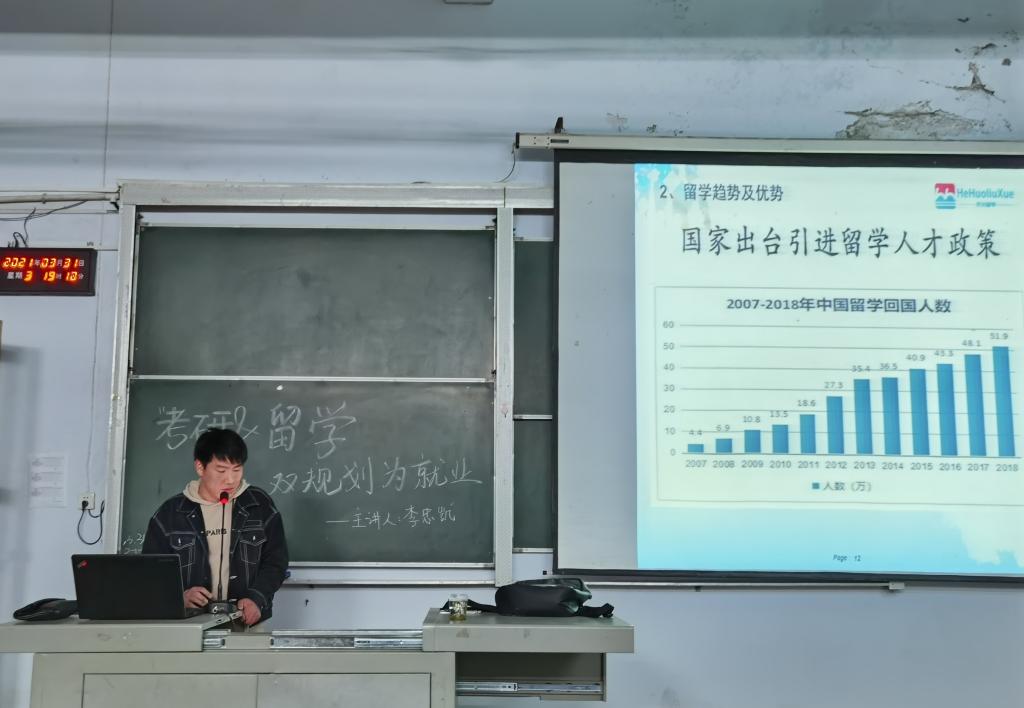 时间:2021-04-01 编辑:学生科 点击:本网讯(通讯员 李梦然/摄影 蓝雨璇 赵雪)3月31日晚,我院学生会学风建设部于文汇楼6401教室成功举办“考研&留学” 双规划知识讲座,36365官网校友李忠凯担任此次讲座主讲人,俄语老师刘波莅临现场进行指导。