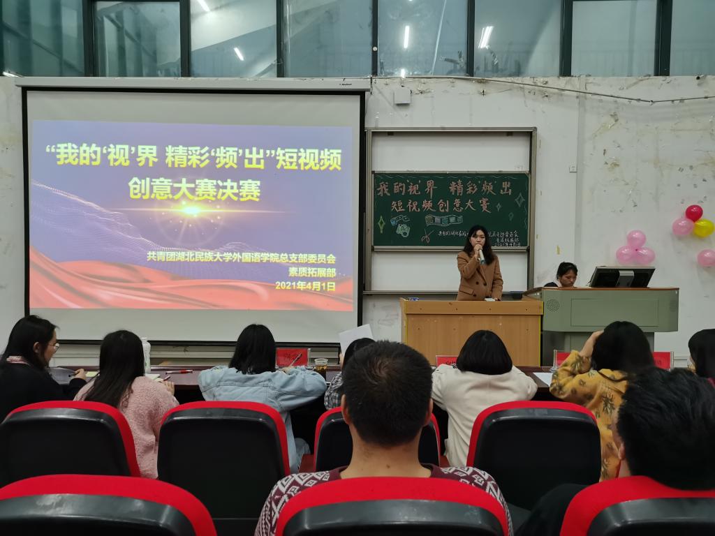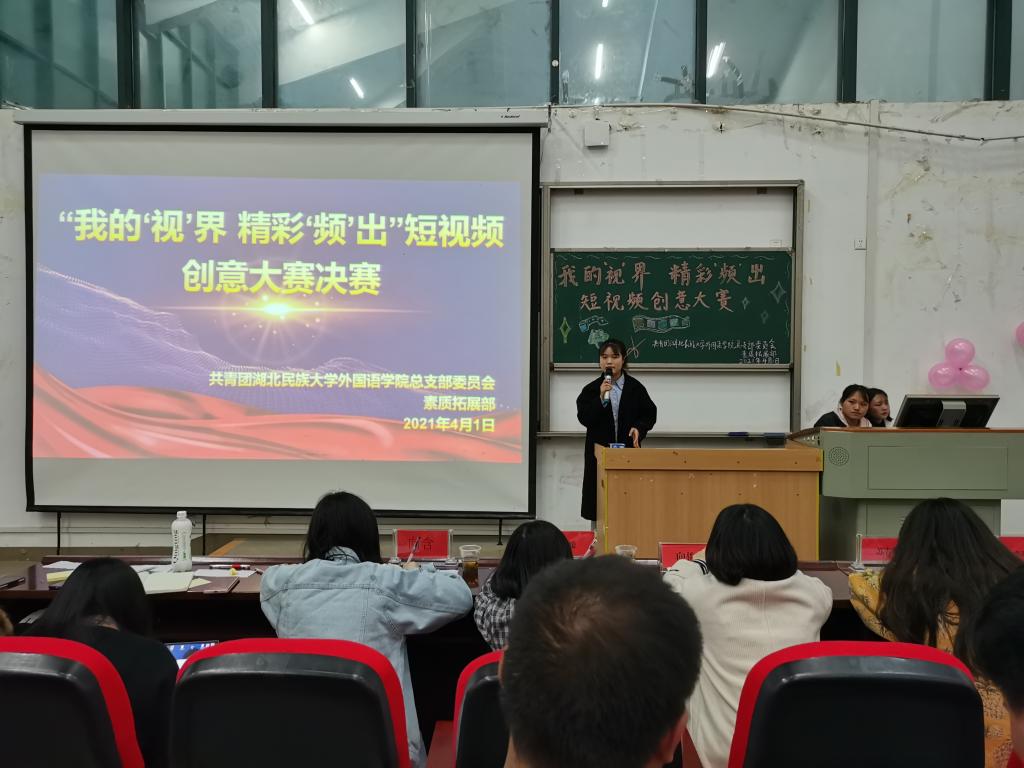 本网讯(通讯员 李梦然/摄影 王芷依)4月1日晚,我院于修远楼5B404教室成功举办以我的“视”界 精彩“频”出为主题的短视频创意大赛决赛。团总支副书记向俊逸、团总支社工部部长陈媛、团总支办公室部长苏春辉、团总支宣传部部长向含、团总支社管部部长李晓倩莅临现场担任评委。