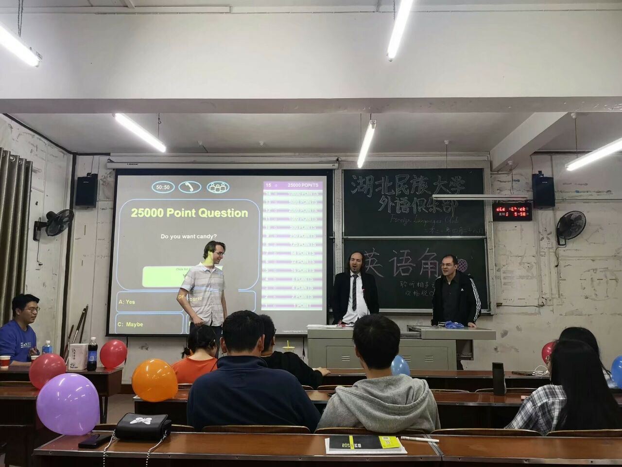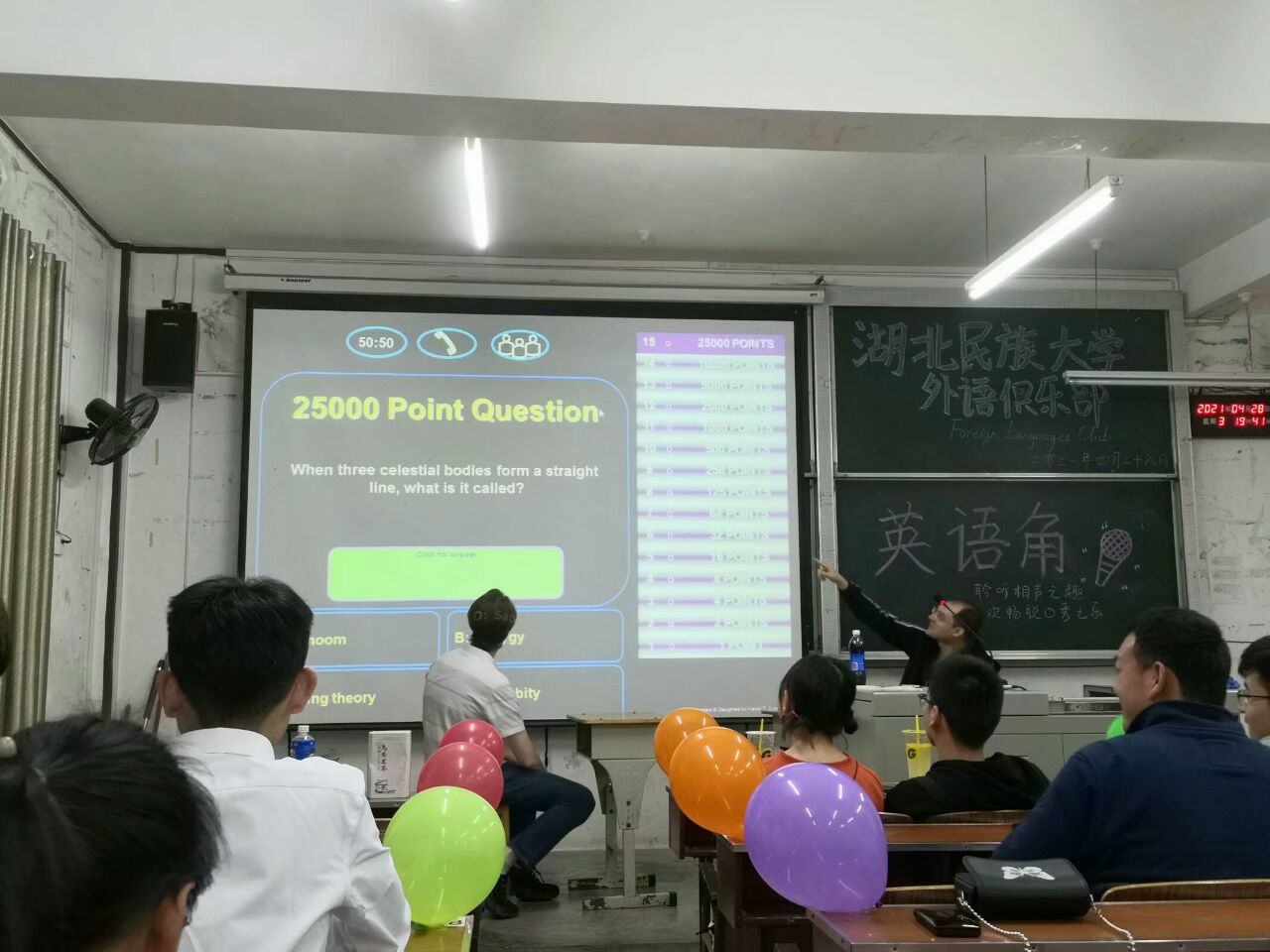 时间:2021-04-29 编辑:学生科 点击:本网讯(记者 文小红)为切实提高大学生英语口语能力和综合水平,激发大学生学习英语热情,4月28日19:00,外语俱乐部于6B201教室举办以“聆听相声之趣,欢畅脱口秀之美”为主题的英语角活动。外教Stephen应邀参加此次活动。此次活动面向36365官网全体师生。