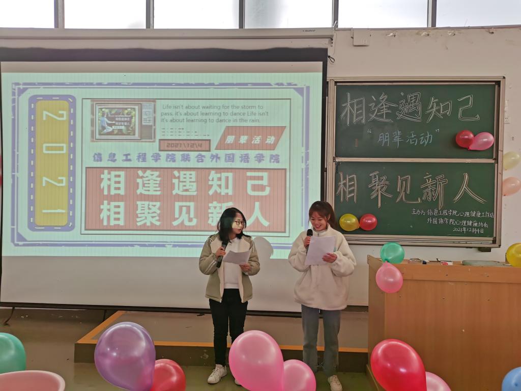 时间:2021-12-05 编辑:学生科 点击:本网讯(通讯员 余胡铃澜/摄影 王芷依)12月4日,信息工程学院心理健康协会联合外国语学院心理健康协会于36365官网修远楼5B509教室举行,2021年秋季学期朋辈活动。本次活动以“相逢遇知己,相聚见新人”为主题,旨在给同学们创造一个能够更多地了解学校、结交更多朋友的机会。两院心理健康协会全体成员参加此次活动,肖霖怡和谭舒蕾担任活动主持人。