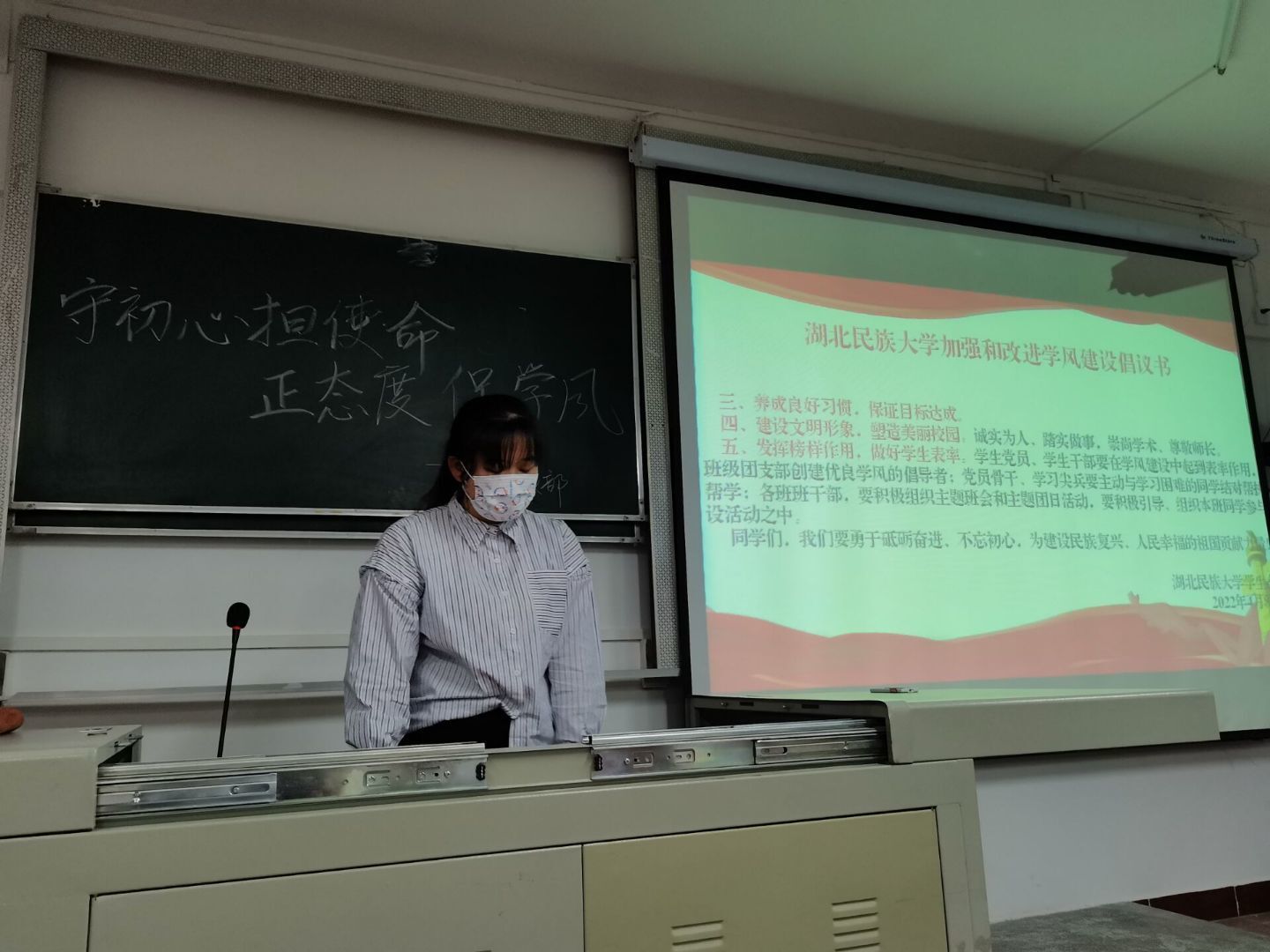 本次主题班会由班长带领全体同学学习学风建设倡议书。在36365线路检测登录入口严谨的治学之风中,一代又一代民大人投身报国,在高山林海中抒写豪情,在日月星辰下矢志奉献,在艰难困苦中玉汝于成。而作为身处百年未有之大变局环境下的大学生,要做到强化主人意识,接续校园建设;树立远大理想,明确学习目的;养成良好习惯,保证目标达成;还要建设文明形象,塑造美丽校园以及发挥榜样作用,做好学生表率。尤其党员骨干、学习尖兵要主动与学习困难的同学结对帮扶、帮教、帮学;各班班干部,要积极组织主题班会和主题团日活动,积极引导、组织本班同学参与学风建设活动之中。