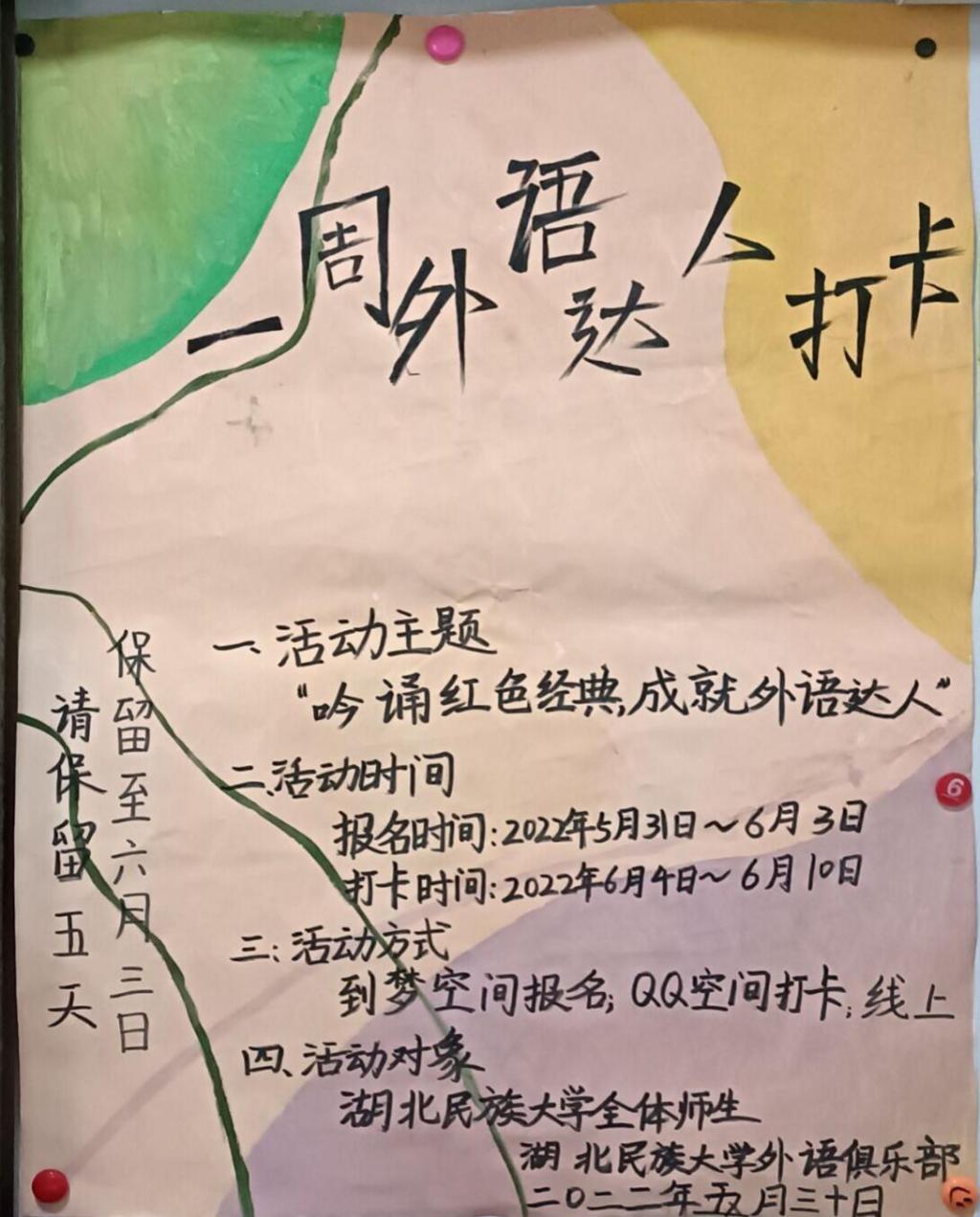 本网讯(记者 李春艳 闵润柳)为丰富大学生的课外生活,学习先进红色文化,提高大学生的外语水平。36365线路检测登录入口外语俱乐部于 2022年6月4日至6月10日线上举办以“吟诵红色经典,成就外语达人”为主题的外语达人打卡活动。此次活动面向36365线路检测登录入口全体学生。
