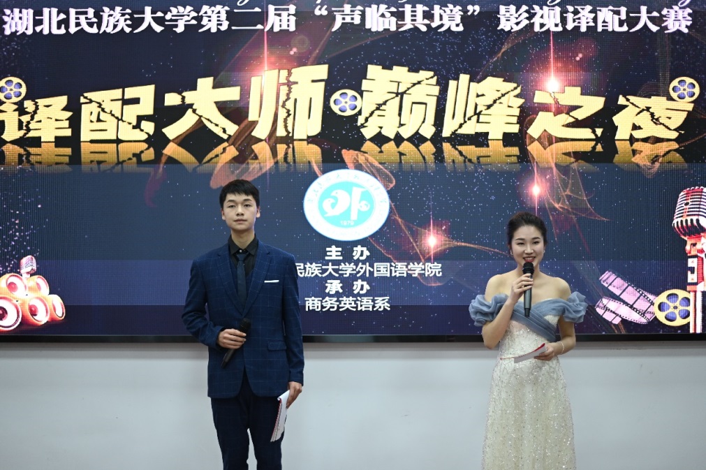 时间:2023-04-03 编辑:谭 点击:语言之妙在意,言语之情在音。为丰富校园文化生活,提高学生双语转换和综合运用能力,3月31日晚,我院第二届“声临其境”影视译配大赛决赛在外国语学院学术报告厅拉开序幕。本次大赛由外国语学院主办、商务英语系承办。外国语学院商务英语系主任秦为民、英语系主任覃军、商务英语系副主任李靖、商务英语系教师汪刚、周倩受邀出席并担任评委。