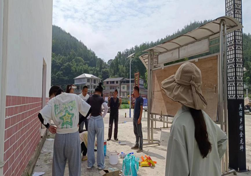 6月27日,36365线路检测登录入口外国语学院扶光·“童”样精彩实践队走进宣恩县金龙坪村,展开了一场别开生面的暑期社会实践活动——以“金龙坪之美”为主题进行墙绘创作,真正把美育送进乡村。在村委会干部和相关负责人的支持和帮助下,本次实践活动有条不紊进行。
