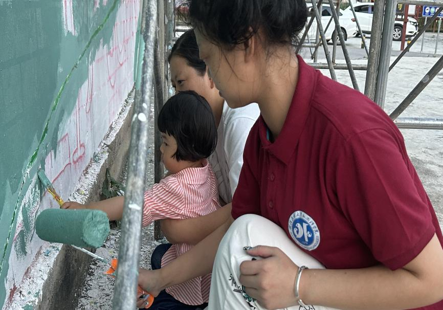 在墙绘制作的过程中,村民们纷纷驻足观看,孩童们更是兴奋不已。团队成员们耐心地为村民讲解绘画作品每一部分的绘作意义,与村民们互动交流,共同感受这份来自乡村的纯粹与美好。与此同时,团队成员们带领儿童亲自体验墙绘活动,在手把手的教学过程中让留守儿童体验绘画与艺术的美好。在团队成员的鼓励下,一个个充满好奇心的小孩加入了创作队伍,他们手持小刷子,小心翼翼地在墙上添上自己的色彩,每一笔都充满了童真与快乐。