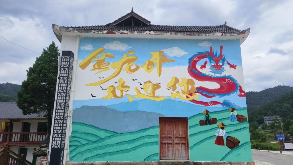 队员们在村委会建筑墙面上开始作画,分工协作、挥洒汗水、色彩交织,历经八天的持续“战斗”,队员们为金龙坪村“献上”了一幅和谐的美丽乡村画卷,一幅生动逼真的墙绘作品逐渐呈现在眼前。作品的上半部分,一条腾云驾雾的金龙盘旋而上,栩栩如生,既彰显了“金龙坪”之名,又寄托了村民们对美好生活的向往。而作品的下半部分则是连绵不绝的茶田风光,嫩绿的茶叶在阳光下泛着光泽,仿佛能闻到那清新的茶叶香,让人心旷神怡。