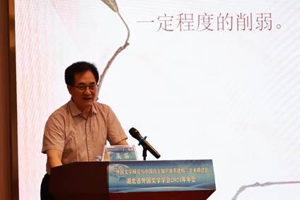 开幕式后,大会进入学术交流环节。此次大会的主题是外国文学研究与中国自主知识体系建构。湖北省外国文学学会副会长、武汉大学涂险峰教授主持了第一场专家主旨发言。