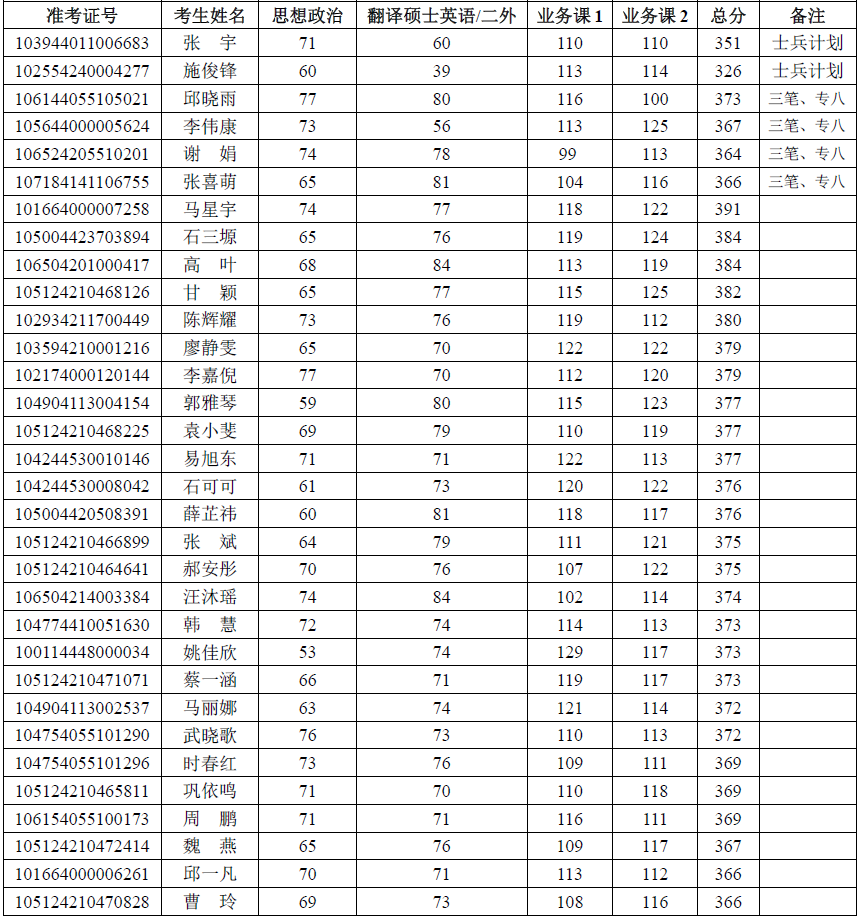 若总成绩相等,按初试总成绩从高到低排序进行录取;若初试总成绩相等,按政治与外语成绩之和从高到低排序进行录取;若政治与外语成绩之和相等,按业务课一成绩从高到低排序进行录取。