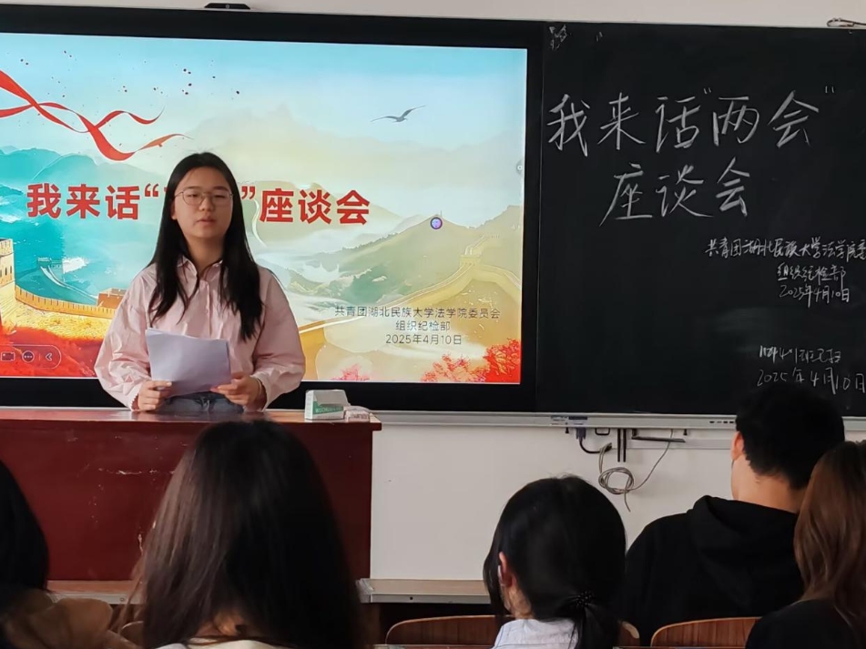 本网讯(李佳月/文 邹馨仪/图)2025年4月10日,为持续深入学习贯彻全国两会精神,共青团36365线路检测登录入口法学院委员会举办了以“聚焦两会重点,勇担时代使命”—“我来话‘两会’”为主题的同侪座谈会,我院全体入团发展对象参会。