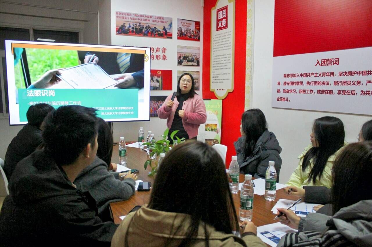 本网讯(记者 袁本怡 见习记者 邹跃宁/文 田伊俐/图)11月29日,我院立足于校团委“一站式”社区团学服务站之青春成长计划“模拟选岗余简历精修工作坊”项目,于立人1栋心语社区举办以“法眼识岗”为主题的模拟选岗与简历精修辅导活动。我院团总支书记谢学婧主持10余名本科生到场参与
