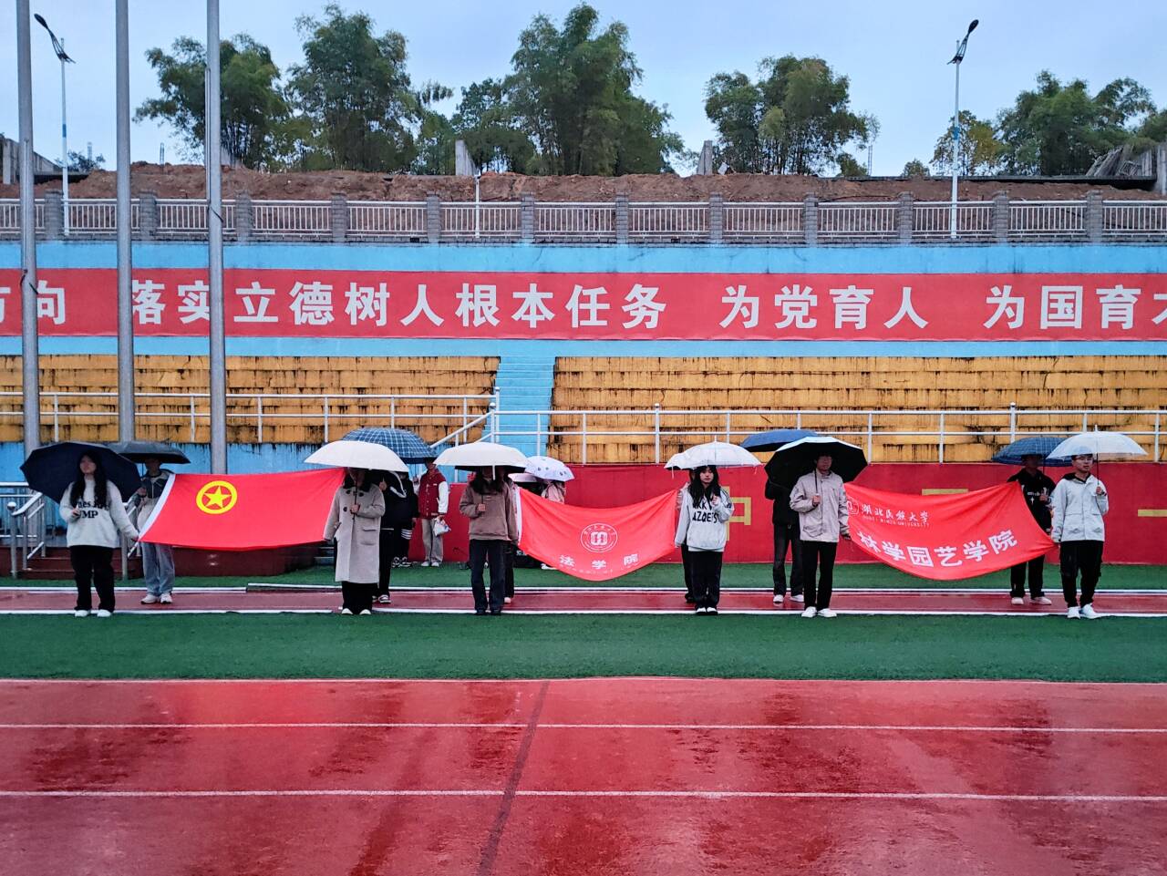 活动伊始,举行升旗仪式,全体到场人员齐唱国歌、团歌、重温入团誓词。随后,两院学生代表合作朗诵诗歌《法之正义,林之华章——塞罕坝礼赞》,歌颂塞罕坝精神。中途由于雨势过大,原计划两院同学合作的民族变迁故事分享会、我院两名学生带来的土家族民歌《六口茶》很遗憾无法正常开展,但全体到场同学以掌声对相关工作人员表达了赞扬与感谢。最后,由谢学婧老师讲授以“七十五载风云路,砥砺前行谱华章”为主题的微团课,她鼓励同学们坚定信念、勤奋学习、自强自立、艰苦奋斗,用青春的力量为祖国的繁荣昌盛添砖加瓦,为民族的伟大复兴铺路架桥。