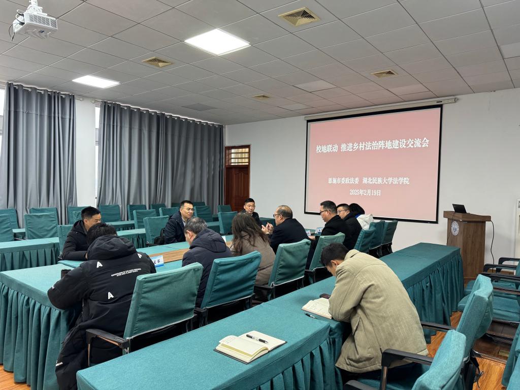 李华军从智库共建、干部轮训、实习实训、普法宣传等方面提出了合作意向。他强调,乡村法治阵地建设是全面推进依法治国的重要基础,必须通过校地联动,充分发挥高校的智力资源和地方政府的实践优势,共同推动乡村法治建设迈上新台阶。李文革详细介绍了学院的基本情况、专业建设、师资力量以及前期与地方合作工作的开展情况。他表示,学院将积极响应地方号召,充分发挥自身优势,为恩施乡村法治阵地建设提供强有力的智力支持和人才保障。会上,汪燕等参会领导就双方长期合作事宜进行了友好交流。