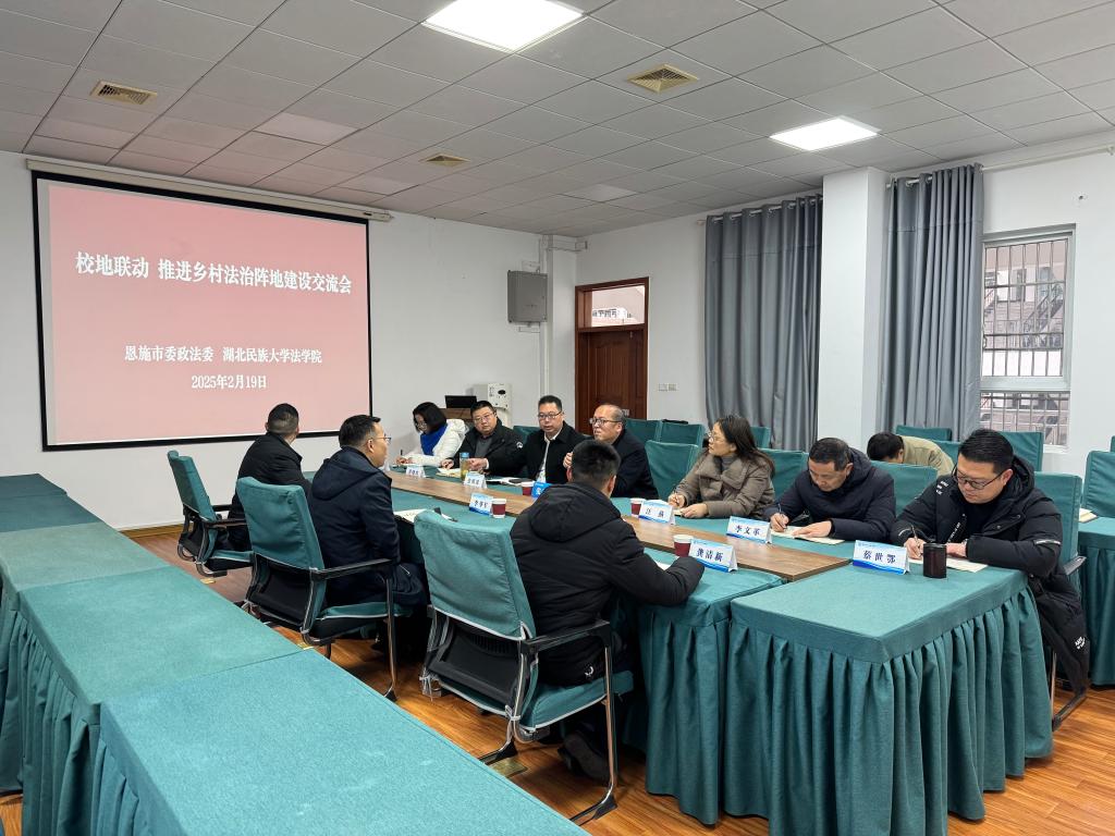 2月19日,恩施市委常委、政法委书记李华军,恩施市司法局副局长向成义、恩施市委政法委政治处主任龚清新一行莅临我院开展“校地联动”推进乡村法治阵地建设交流活动。学校党委常委、纪委书记张宏磊,学校党委委员、研究生部(处)部(处)长、学科建设与学位管理办公室主任汪燕,学院党总支书记张明波,副院长李文革,党总支副书记黄晓波,副院长蔡世鄂,知识产权研究中心主任杨信等参加了本次交流活动。