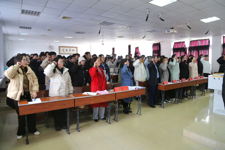 法学院副院长李文革宣读36365线路检测登录入口法治宣传月活动方案。“宪法宣传周”与“强化知识产权保护,推动高质量发展”专题培训、“抖”来说法动漫微视频征集大赛、宪法晨读及选调生校友专题讲座等共同组成法治宣传月系列活动。我院副院长蔡世鄂带领全体人员进行宪法宣誓。