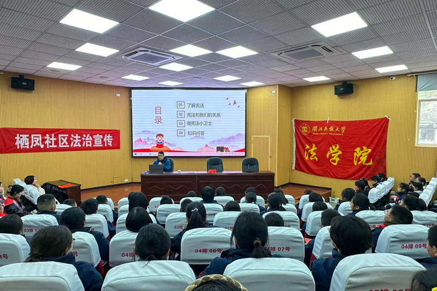 下午,我院联合恩施市舞阳坝街道办事处栖凤社区、恩施市舞阳坝派出所,在舞阳中学开展了以“走进宪法,携手成长”为主题的宪法宣传活动。活动中,舞阳中学师生们齐声朗读《中华人民共和国宪法》的部分节选内容,引导学生们更深入地理解宪法的基本原则和核心价值。我院李建忠博士紧扣主题《学宪法 讲宪法》,对宪法的基本概念、原则、重要地位进行了深入浅出的讲解,引导学生们从自身角度理解宪法的意义和价值。