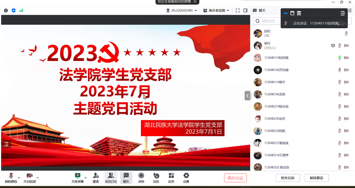 学生党支部通过腾讯会议的形式开展庆“七一”系列活动。首先在主题党日中,吴鑫同志领誓了入党誓词、第一党小组诵读了党章第一二节内容、杨玲同志领学了习近平总书记在文化传承发展座谈会上的重要讲话精神,组织党员学习了纪委下发的视频辅导资料《政务处分法》等内容。其次在主题教育活动中,阙嘉苗同志领学了《习近平新时代中国特色社会主义思想专题摘编》中坚持在发展中保障和改善民生、坚持人与自然和谐共生两章内容,刘薇同志领学了《习近平著作选读》部分内容。