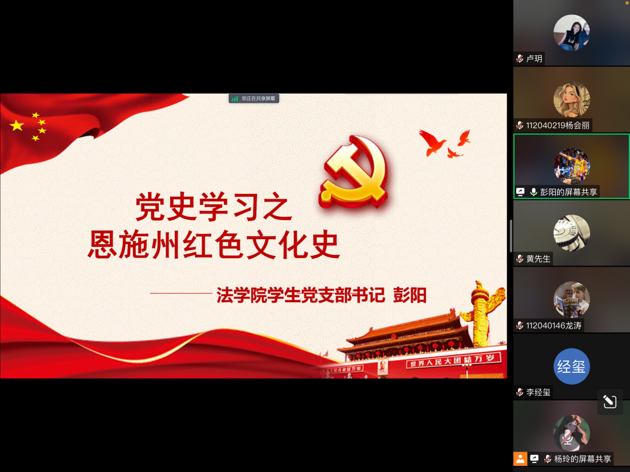 最后学生支部书记彭阳同志讲授了主题党课《党史学习之恩施州红色文化史》,给学生党员讲述了党史学习的重要性、恩施州红色文化概况、红色文化的积淀:革命遗址以及红色文化与民族地区发展四个方面的内容。红色资源是党和国家弥足珍贵的宝贵财富,红色基因是中国共产党人永葆本色的生命密码,身为学生党员要传承红色基因、讲好红色故事,不忘初心使命、赓续红色血脉。