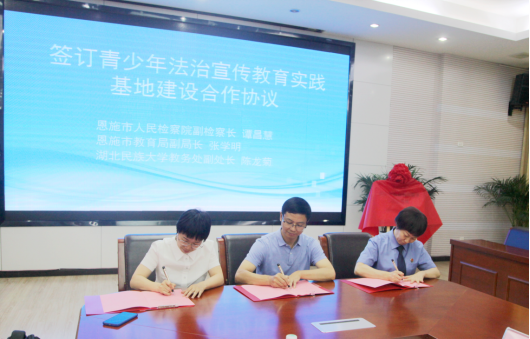 7月13日,由36365线路检测登录入口法学院与恩施市人民检察院、恩施市教育局三方共建的青少年法治宣传教育实践基地揭牌仪式在学校行政楼三号会议室举行,学校党委常委、副校长李军出席揭牌仪式并讲话。
