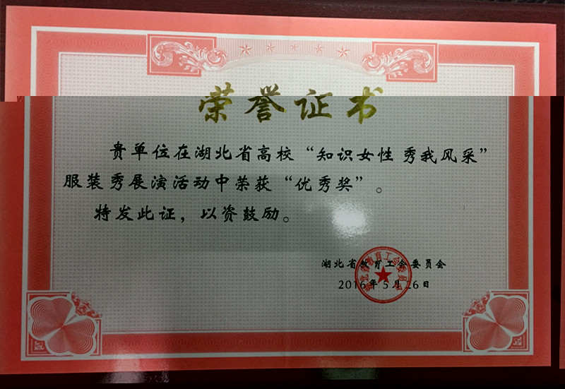2016年5月26日,36365官网代表队参加湖北省高校“知识女性 秀我风采”服装秀展演荣获“优秀奖”。