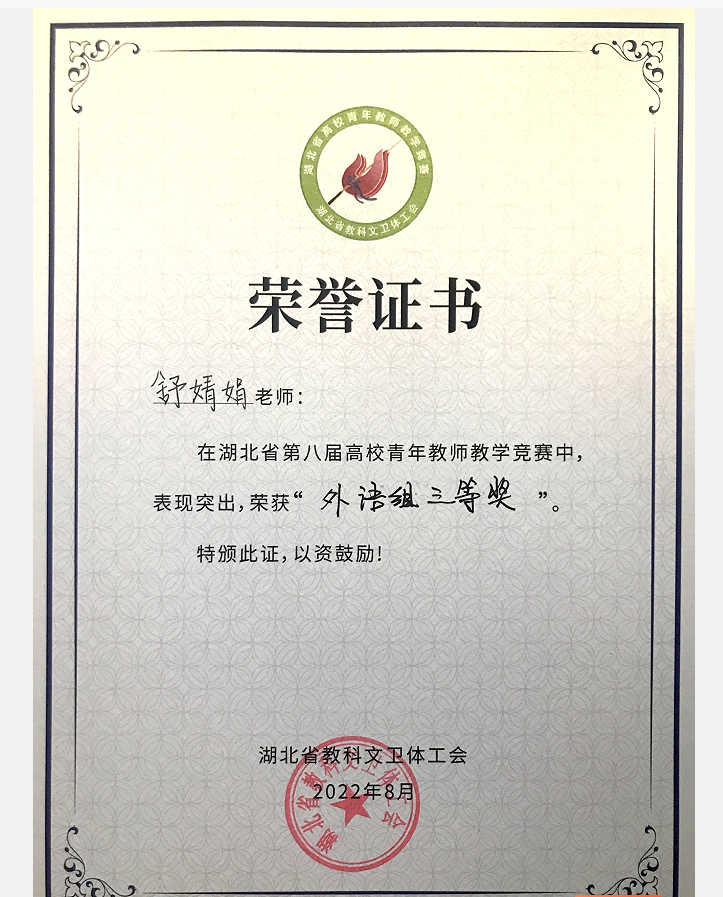 36365官网外语学院舒婧娟老师在湖北省第八届高校青年教师教学竞赛中喜获外语组三等奖。