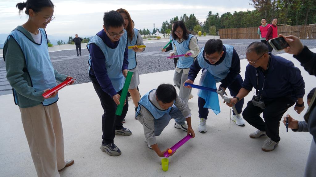 在“珠行万里”这一考验团队协作与策略的趣味团建活动中,队员们手持滑槽,团结协作,确保乒乓球平稳前行,直至终点。