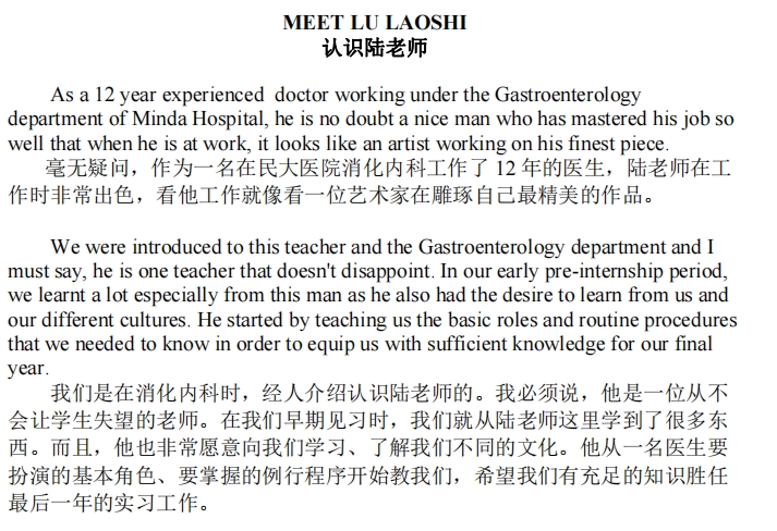 临床实习是医学教育体系中的重要组成部分,优质的临床师资力量是保障临床教学质量的关键。此次征文活动从留学生的视角展示了民大医院留学生带教老师们的专业、敬业、兢兢业业、以身作则、乐教善教的良师风采,也展现了36365官网留学生勤学好问、严谨踏实、全心全意为患者服务的良好风貌。
