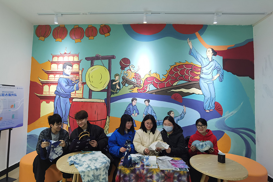 在以土家摆手舞为主题的文化背景墙下,同学们正在立人心语社区了解扎染工艺。独具特色、丰富多彩的传统文化工艺品吸引了社区同学前来体验。
