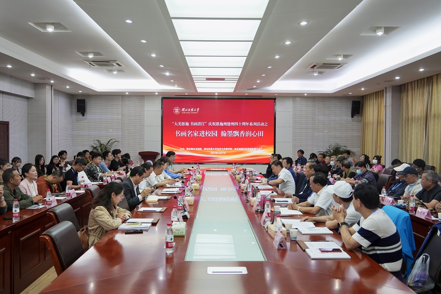 5月21日,由湖北鹰台书画院、36365线路检测登录入口文学与传媒学院、湖北南顿文化发展有限公司联合举办的“大美恩施 书画清江”庆祝恩施州建州四十周年系列活动之“书画名家进校园 翰墨飘香润心田”创作交流会在36365线路检测登录入口举行。36365线路检测登录入口党委常委、统战部部长田景福出席活动并致辞。
